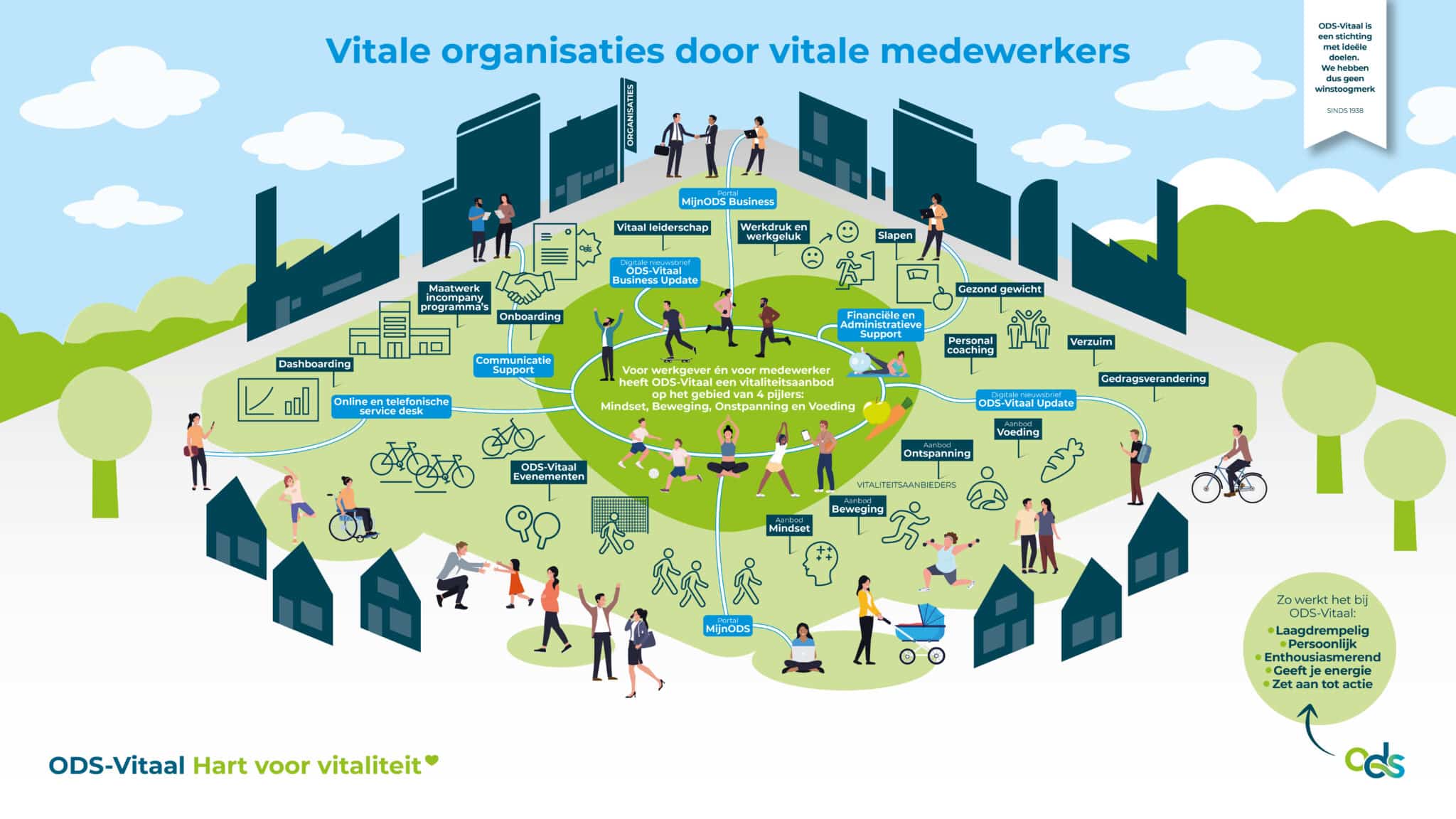 ODS-Vitaal richt zich op het stimuleren van sport, duurzame inzetbaarheid, vitaliteit en welzijn van de medewerkers met hun gezinnen en de gepensioneerden van de aangesloten bedrijven. ODS-Vitaal realiseert haar doelen door het aanbieden van een aantrekkelijk en divers activiteitenaanbod door heel Nederland. We doen dit met betrokken en enthousiaste mensen (team, bestuur en vrijwilligers) in samenwerking met onze vitaliteitsaanbieders.